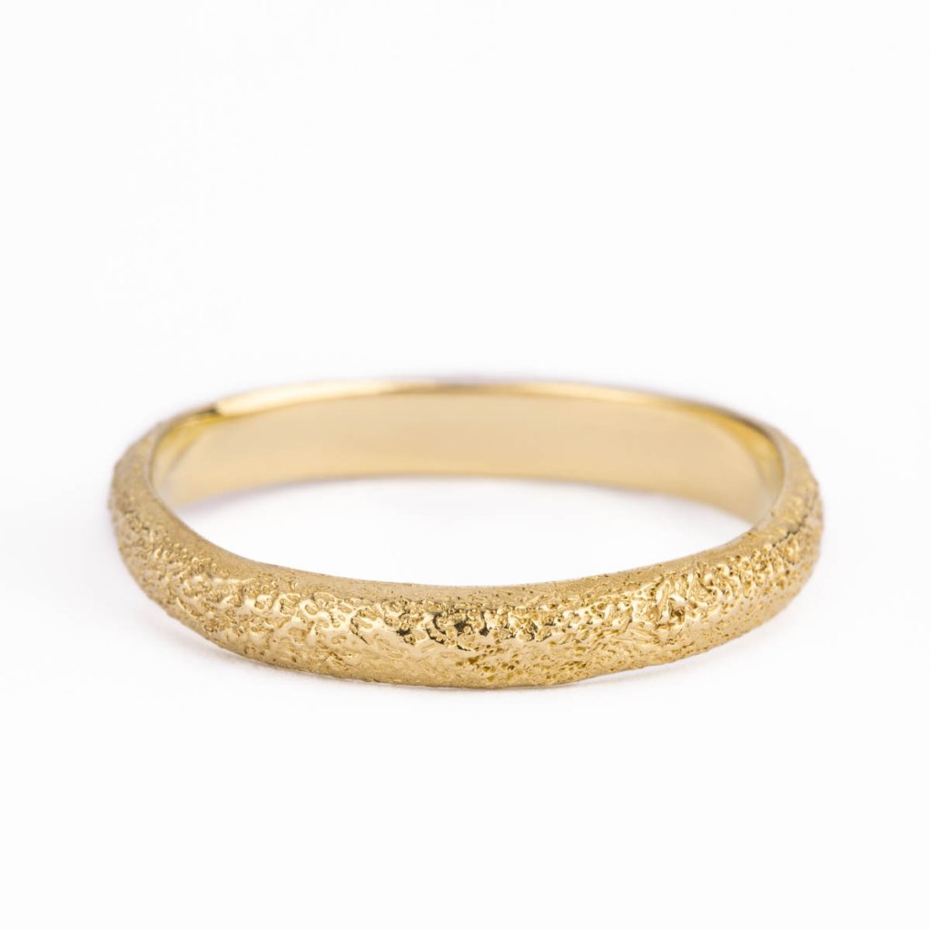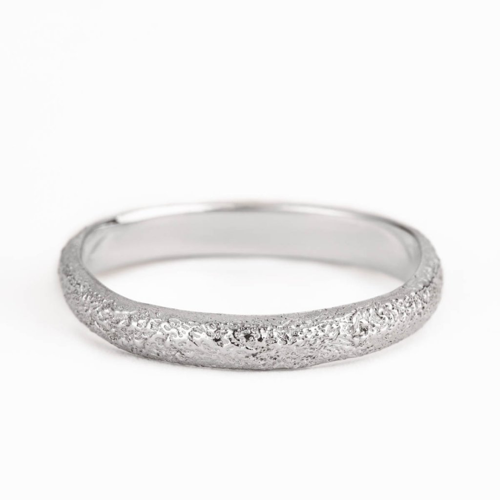 Pánský snubní prsten s jemně texturovaným povrchem inspirovaným pouštní krajinou. Zrnitá struktura evokuje přirozenou erozi formovanou časem a neustálým pohybem a zanechává na každém prstenu osobitý charakter i jemnou stopu jedinečnosti.