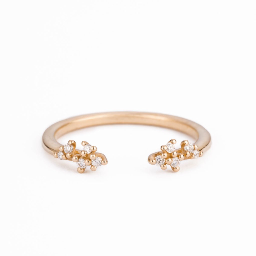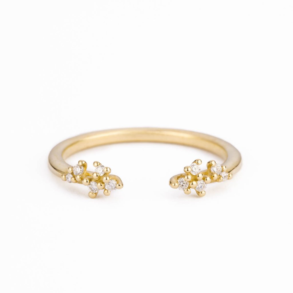 Prsten Atheia z kolekce Floralia zdobí jemné kvítky jiskřivých diamantů, které jsou zasazeny na obou koncích otevřené obroučky. Tento design umožňuje perfektní kombinaci se zásnubními či snubními prsteny.