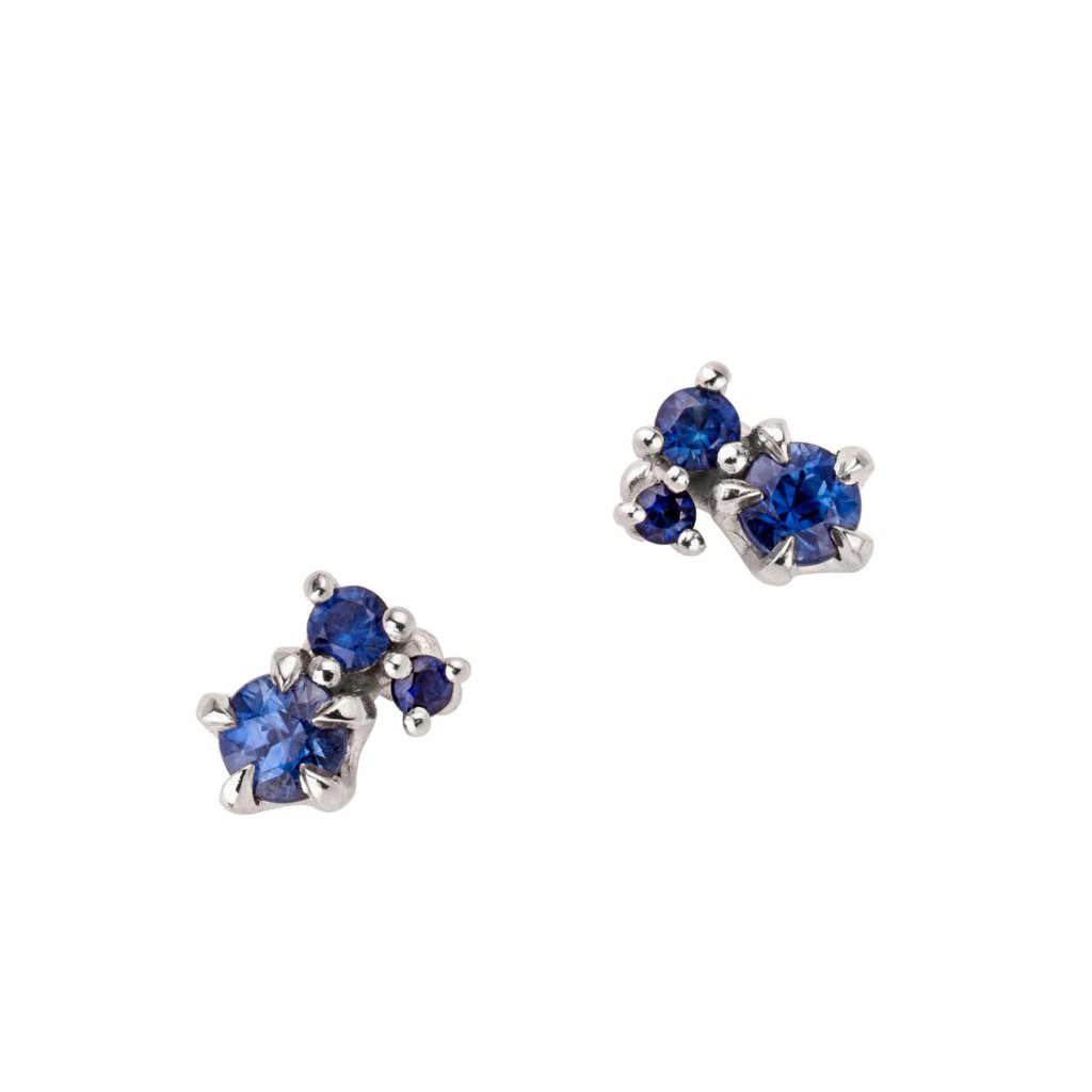 Dynamické seskupení safírů s dominantním kamenem o velikosti 3 mm. Drápkovité krapny držící kámen v kontrastu s jemnými zrnky propůjčují šperku hravost. Náušnice pro každodenní nošení i slavnostní chvíle.