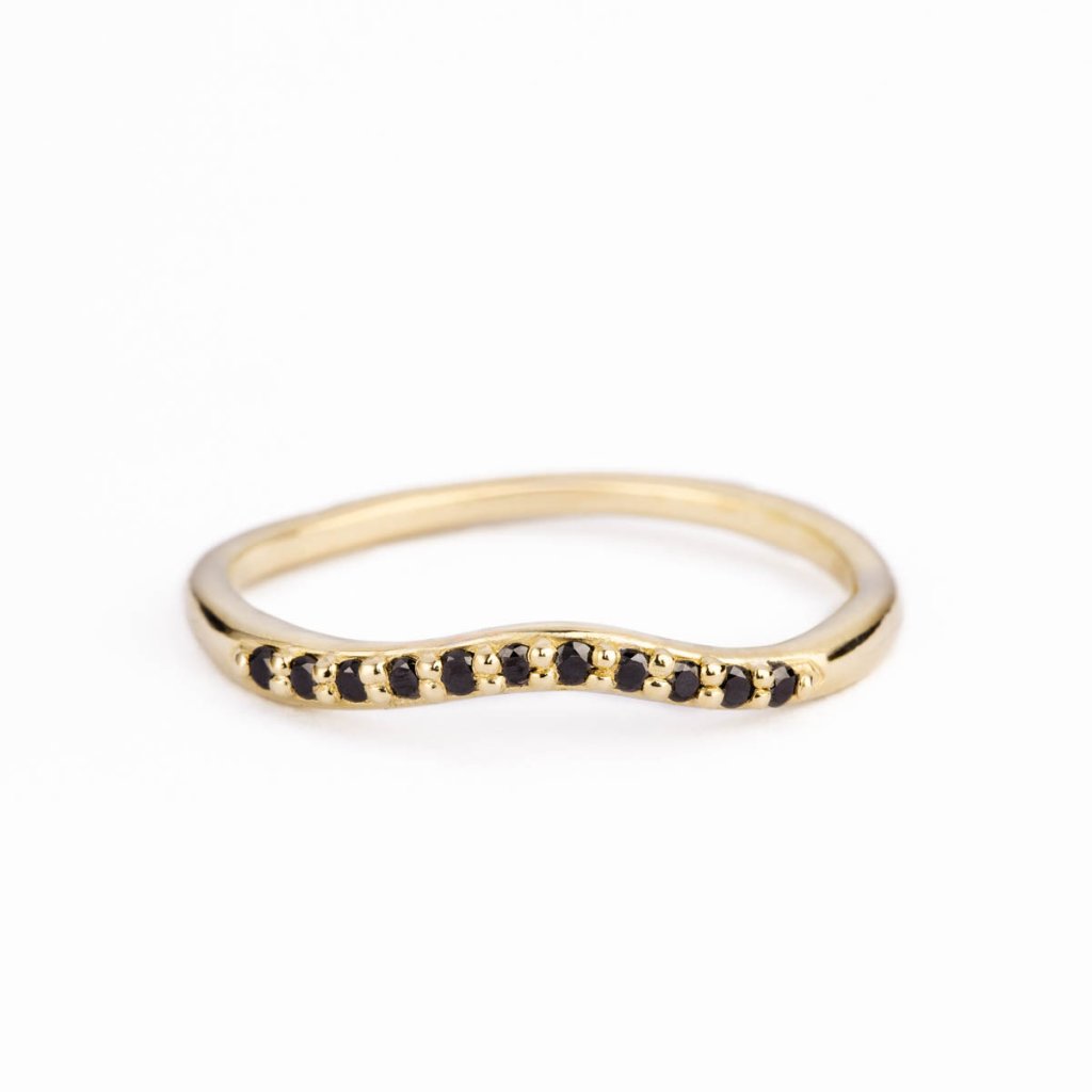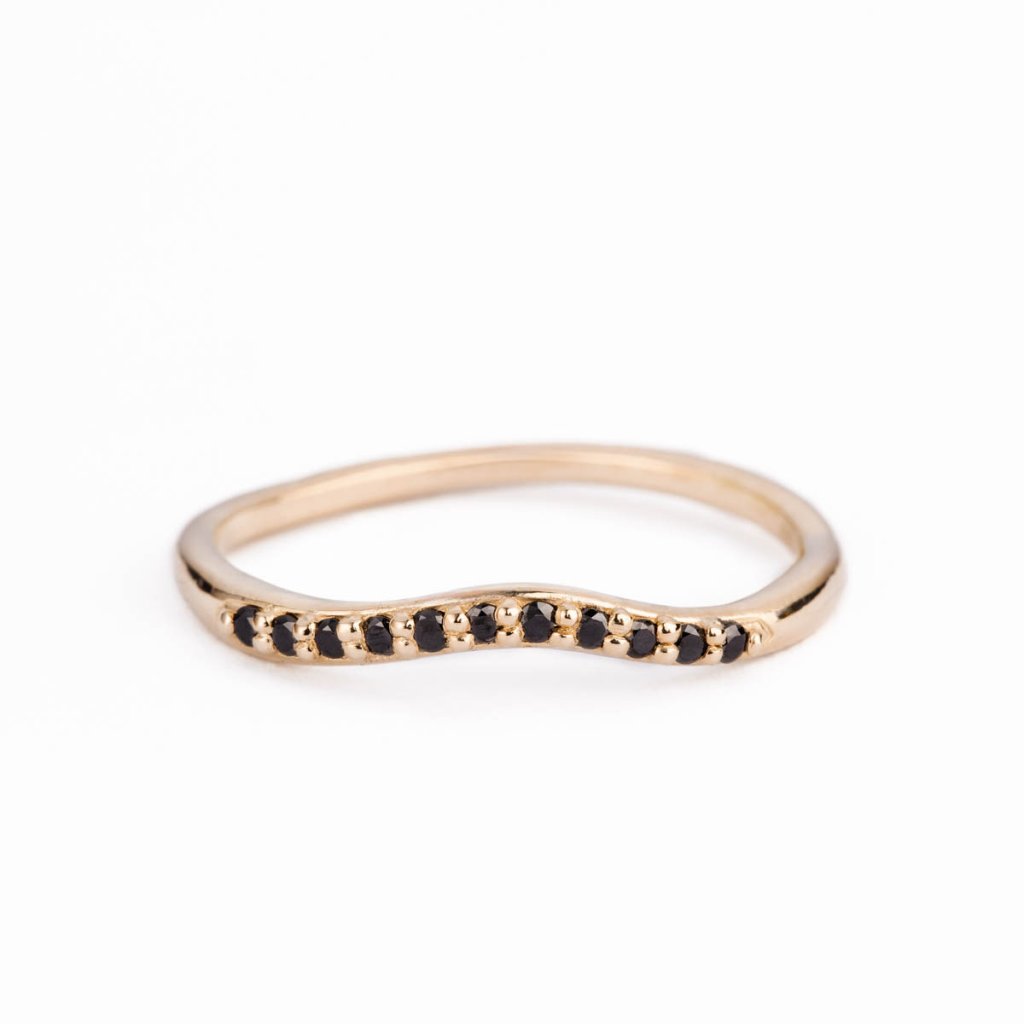 Fluidum Half Eternity Black Diamond je prsten ze 14kt zlata osazený 11 černými diamanty, které mu dodávají výrazný, elegantní kontrast. Obroučka se lehce vlní, takže prsten působí zajímavě i při pohledu z boku — jemná, živá linie, která se proměňuje s každým pohybem ruky.