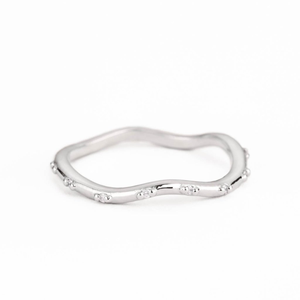 Jemný prsten osazený drobnými diamanty a zdobený výraznějšími zlatými zrnky vyniká při samostatném nošení svou vlnivou siluetou. Je navržený tak, aby se přirozeně sladil s dalšími prsteny z kolekce Fluidum i s většinou zásnubních prstenů.